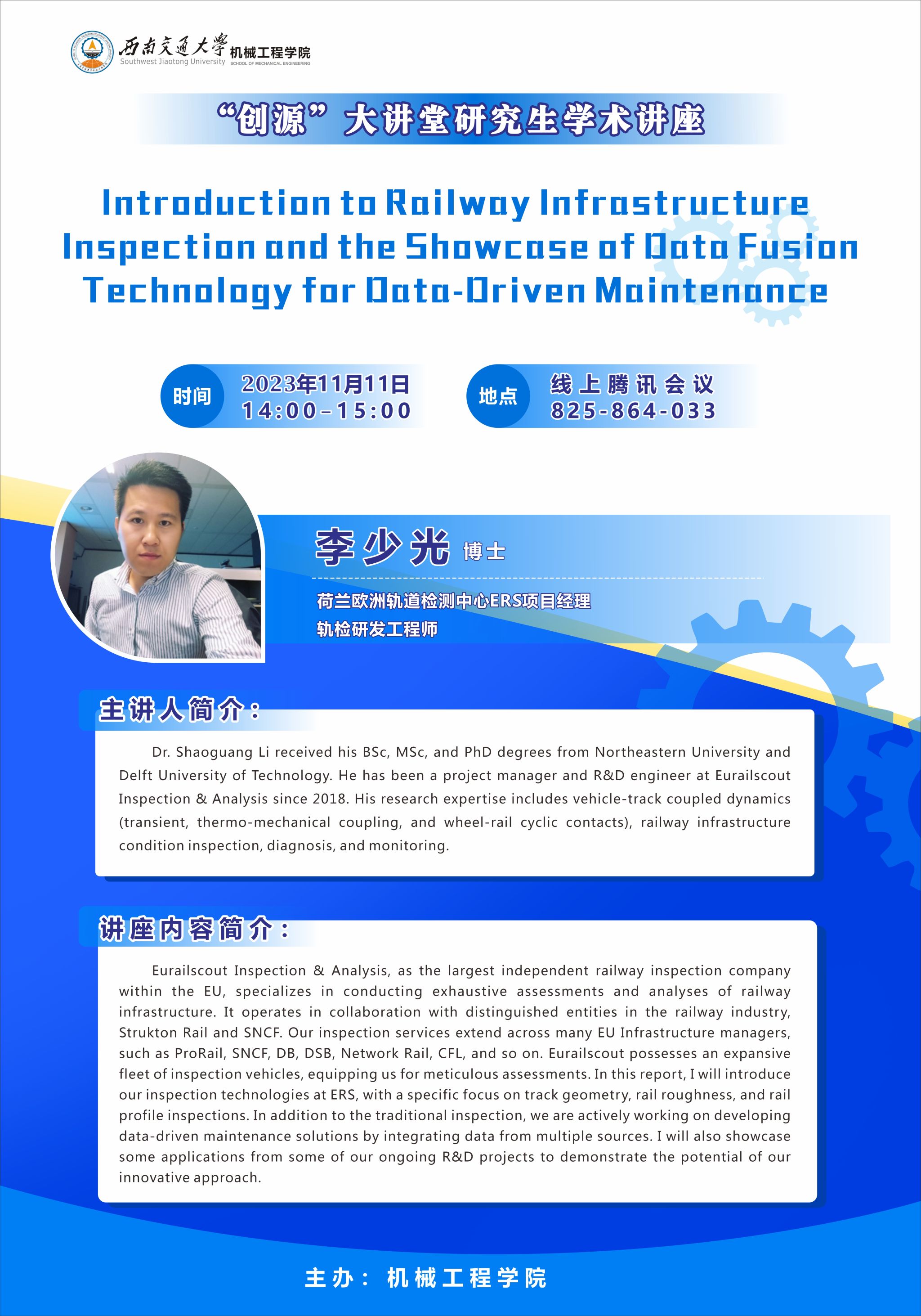 Dr. Shaoguang Li received his BSc, MSc, and PhD degrees from Northeastern University and Delft University of Technology. He has been a project manager and R&D engineer at Eurailscout Inspection & Analysis since 2018. His research expertise includes vehicle-track coupled dynamics (transient, thermo-mechanical coupling, and wheel-rail cyclic contacts), railway infrastructure condition inspection, diagnosis, and monitoring.