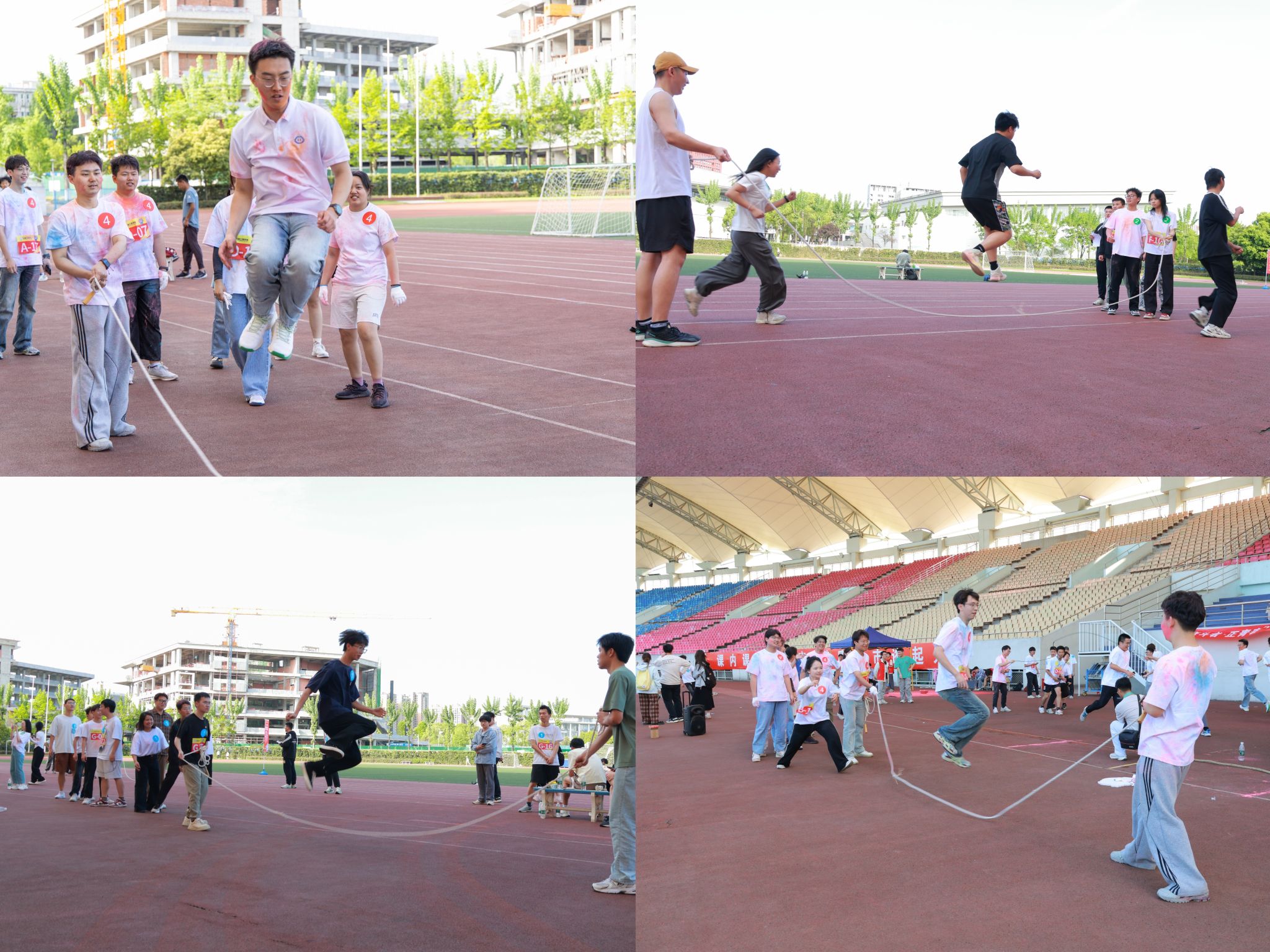 下午5点,活动转场至北区田径场,进入精彩的百团素质拓展环节。全体师生先后参与了包括迎面接力赛、拔河、跳大绳、四人五足等趣味游戏。在“同心协力”接力赛中,队员们配合默契,交接流畅;在“步调一致”四人五足项目中考验团队协调能力,参赛者从踉踉跄跄到配合无间;在“精工协作”跳大绳项目中,要求8字形路线,模拟齿轮啮合运动;在“力拔山河”拔河比赛中,各队使出浑身解数,将活动推向高潮。现场加油声、欢笑声此起彼伏,大家其乐融融,秉承着“友谊第一,比赛第二”的理念,充分彰显了交大机械人友善向上的精神风貌。