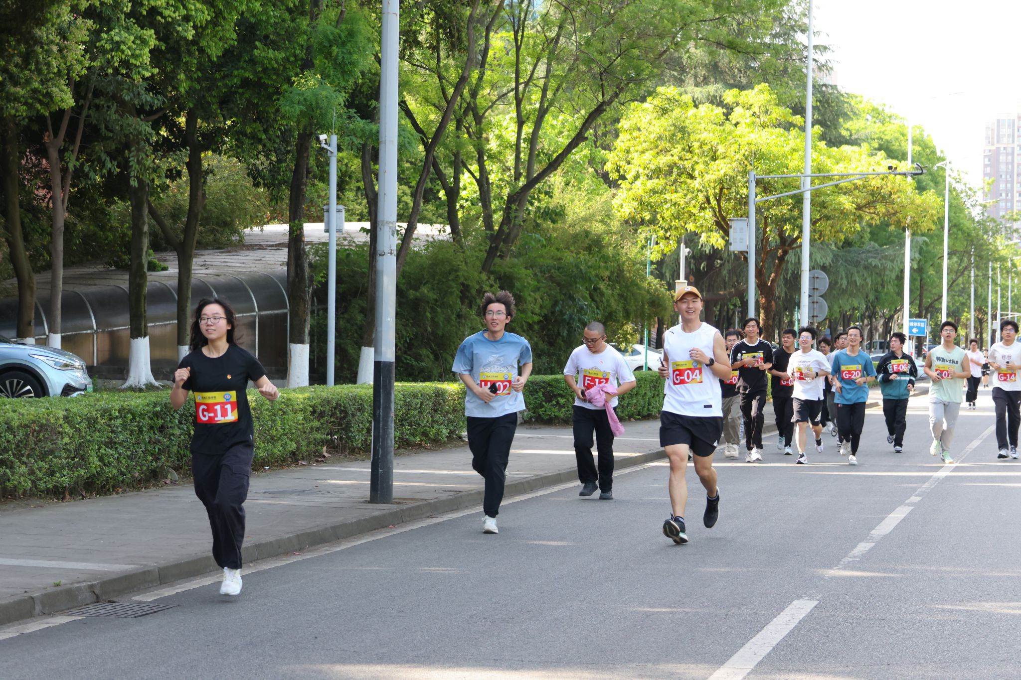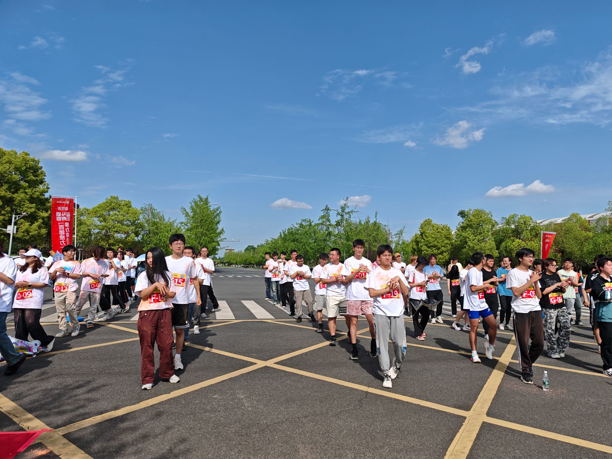 最后,在工作人员带领下全体师生做好热身运动,随着一声令下,环校跑活动正式开始。参与者分为两组,分别沿犀湖和竢实扬华石碑两条路线向北区田径场进发。沿途欢声笑语不断,师生们互帮互助,既欣赏了校园美景,又践行了团结协作的五四精神。