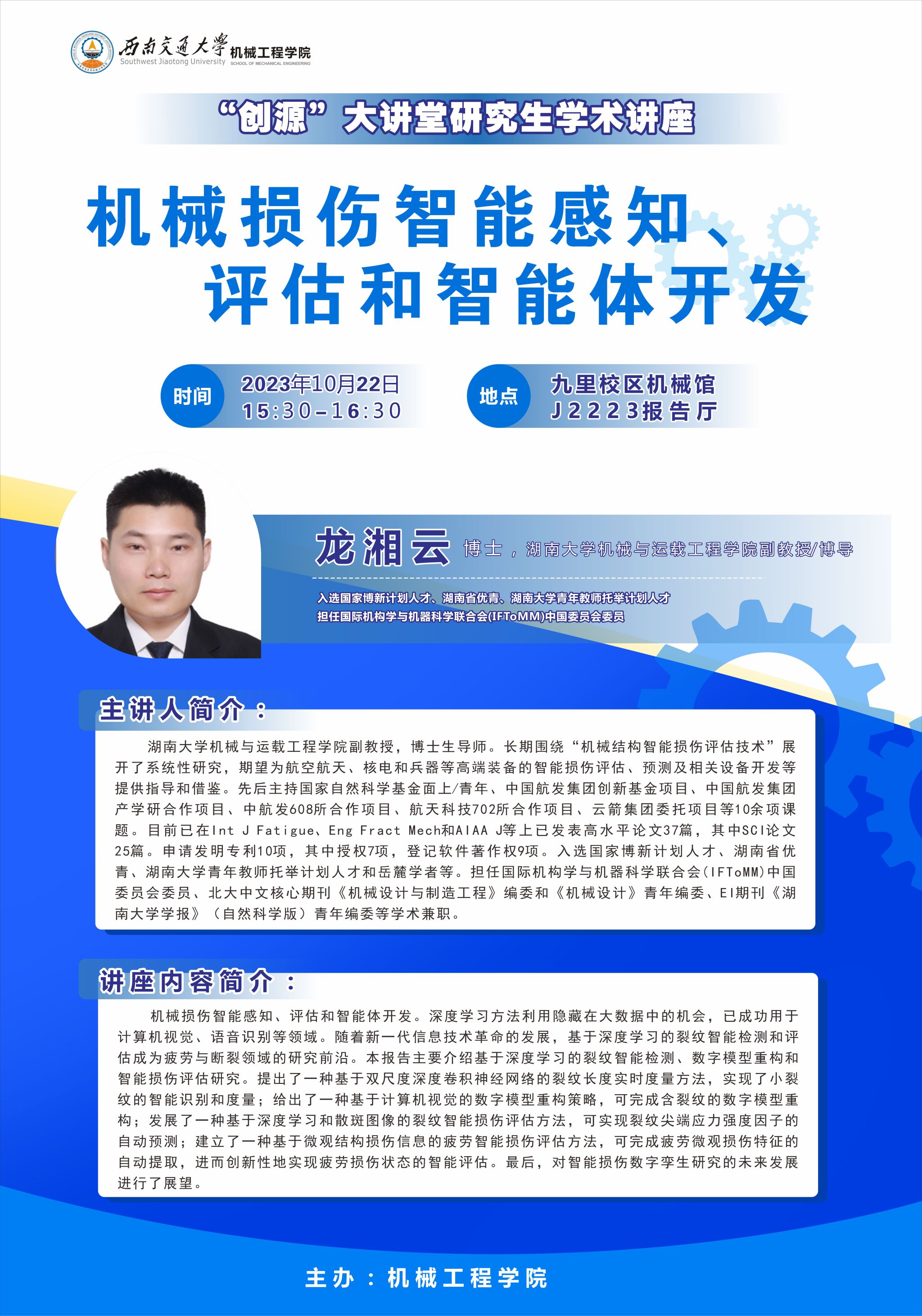 主讲人简介:龙湘云,湖南大学机械与运载工程学院副教授,博士生导师。长期围绕“机械结构智能损伤评估技术”展开了系统性研究,期望为航空航天、核电和兵器等高端装备的智能损伤评估、预测及相关设备开发等提供指导和借鉴。先后主持国家自然科学基金面上/青年、中国航发集团创新基金项目、中国航发集团产学研合作项目、中航发608所合作项目、航天科技702所合作项目、云箭集团委托项目等10余项课题。目前已在Int J Fatigue、Eng Fract Mech和AIAA J等上已发表高水平论文37篇,其中SCI论文25篇。申请发明专利10项,其中授权7项,登记软件著作权9项。入选国家博新计划人才、湖南省优青、湖南大学青年教师托举计划人才和岳麓学者等。担任国际机构学与机器科学联合会(IFToMM)中国委员会委员、北大中文核心期刊《机械设计与制造工程》编委和《机械设计》青年编委、EI期刊《湖南大学学报》(自然科学版)青年编委等学术兼职。