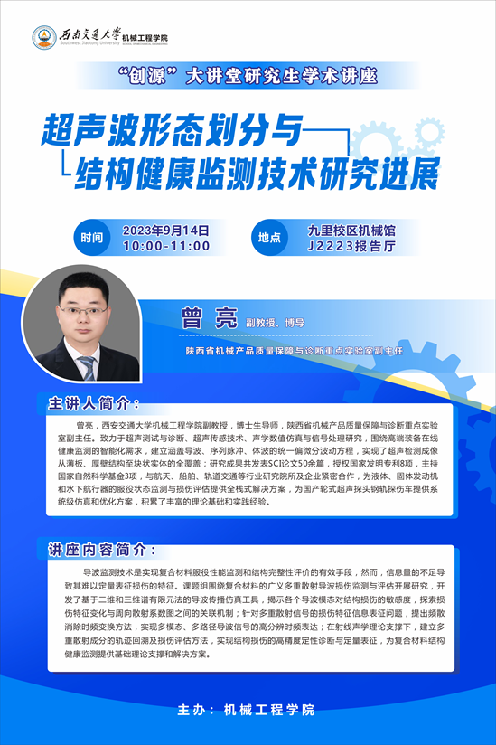 主讲人简介:曾亮,西安交通大学完美体育·(中国)官方网站副教授,博士生导师,陕西省机械产品质量保障与诊断重点实验室副主任。致力于超声测试与诊断、超声传感技术、声学数值仿真与信号处理研究,围绕高端装备在线健康监测的智能化需求,建立涵盖导波、序列脉冲、体波的统一偏微分波动方程,实现了超声检测成像从薄板、厚壁结构至块状实体的全覆盖;研究成果共发表SCI论文50余篇,授权国家发明专利8项,主持国家自然科学基金3项,与航天、船舶、轨道交通等行业研究院所及企业紧密合作,为液体、固体发动机和水下航行器的服役状态监测与损伤评估提供全栈式解决方案,为国产轮式超声探头钢轨探伤车提供系统级仿真和优化方案,积累了丰富的理论基础和实践经验。