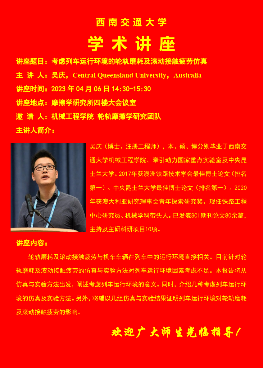 学术讲座:考虑列车运行环境的轮轨磨耗及滚动接触疲劳仿真