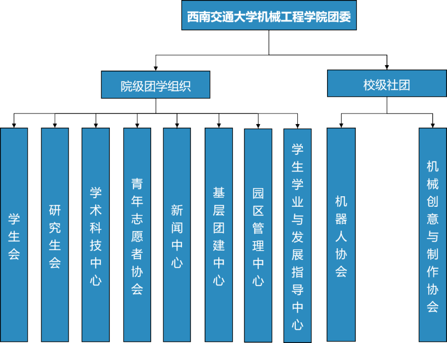 完美体育·(中国)官方网站团委下设学院学生会、学院研究生会、学术科技中心、青年志愿者协会、新闻中心、基层团建中心、园区管理中心、学生学业与发展中心八个院级团学组织,并负责指导西南交通大学机器人协会和机械创意与制作协会开展工作。
